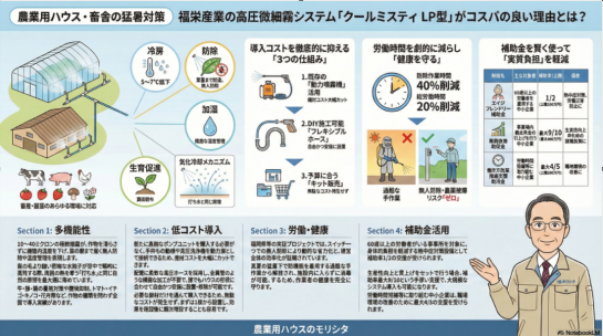 DIY施工と既存動噴利用で初期費用を抑え、補助金制度で負担をさらに軽減できるこのシステムは、プロ農家の経営力強化の有力な選択肢となります。