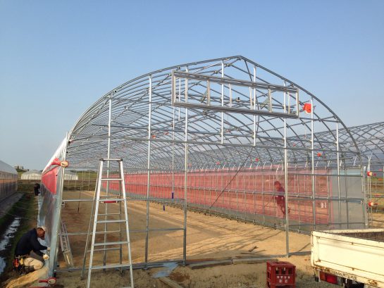 パイプハウスの規格は間口6メートル、奥行50メートル、単棟、アーチパイプ25.4φ、アーチパイプピッチ0.5メートルです。